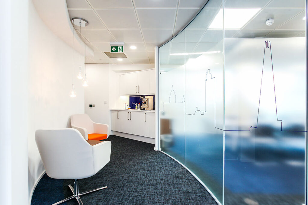 A D&B project by Saracen Interiors the work included the reconfiguration of meeting rooms, including the creation of a centralised and circular meeting room built from curved glass partitions to reflect the company logo; the installation of new floors and ceilings; new furniture; the design and fit of an open plan kitchen and breakout area and the installation of a new air conditioning system. The fit-out timeline was a period of 6 weeks.